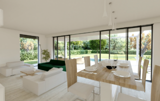 prepojený s obývacou izbou s výstupom na zakrytú terasu. Na poschodí je oddychová zóna s 3 izbami